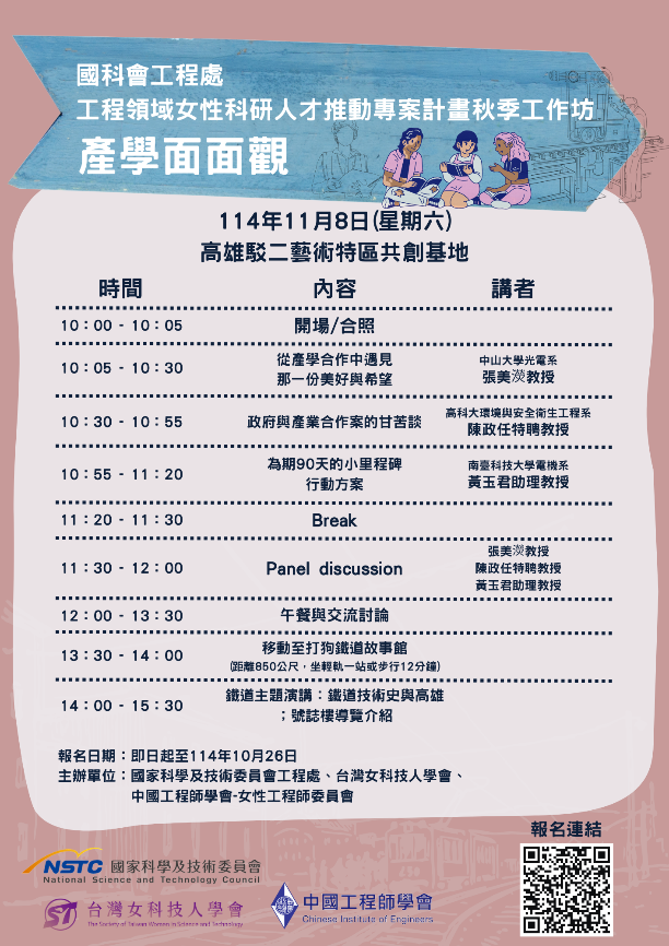 由本中心黃婉甄教授協助辦理的國科會工程處女性科研人才推動專案秋季工作坊 ~『產學攜手向前走』於114年11月8日(六)登場,邀請多位富有產學合作經驗的學者,從不同面向來與參加者分享合作經驗及實務案例,張美濙教授以「從產學合作中遇見那一份美好與希望」為題,分享她在學界與產業界間深耕多年所累積的心得。她提到女性教授在溝通、協調與問題處理上往往具備較柔性的特質,能在複雜情境中化解衝突、順利推動目標。陳政任特聘教授以「政府與產業合作案的甘苦談」為題,分享他在公共安全與環境應變領域超過二十年的第一線經驗。黃玉君助理教授以「為期90天的小里程碑」為題,分享她在微電子工程領域從研究到產學合作的實務經驗。透過產學合作經驗交流,探討合作中的挑戰與機會!